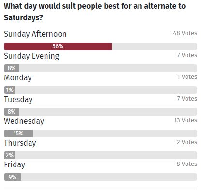 The result was very clear with 56% of the vote being for a Sunday afternoon party.
